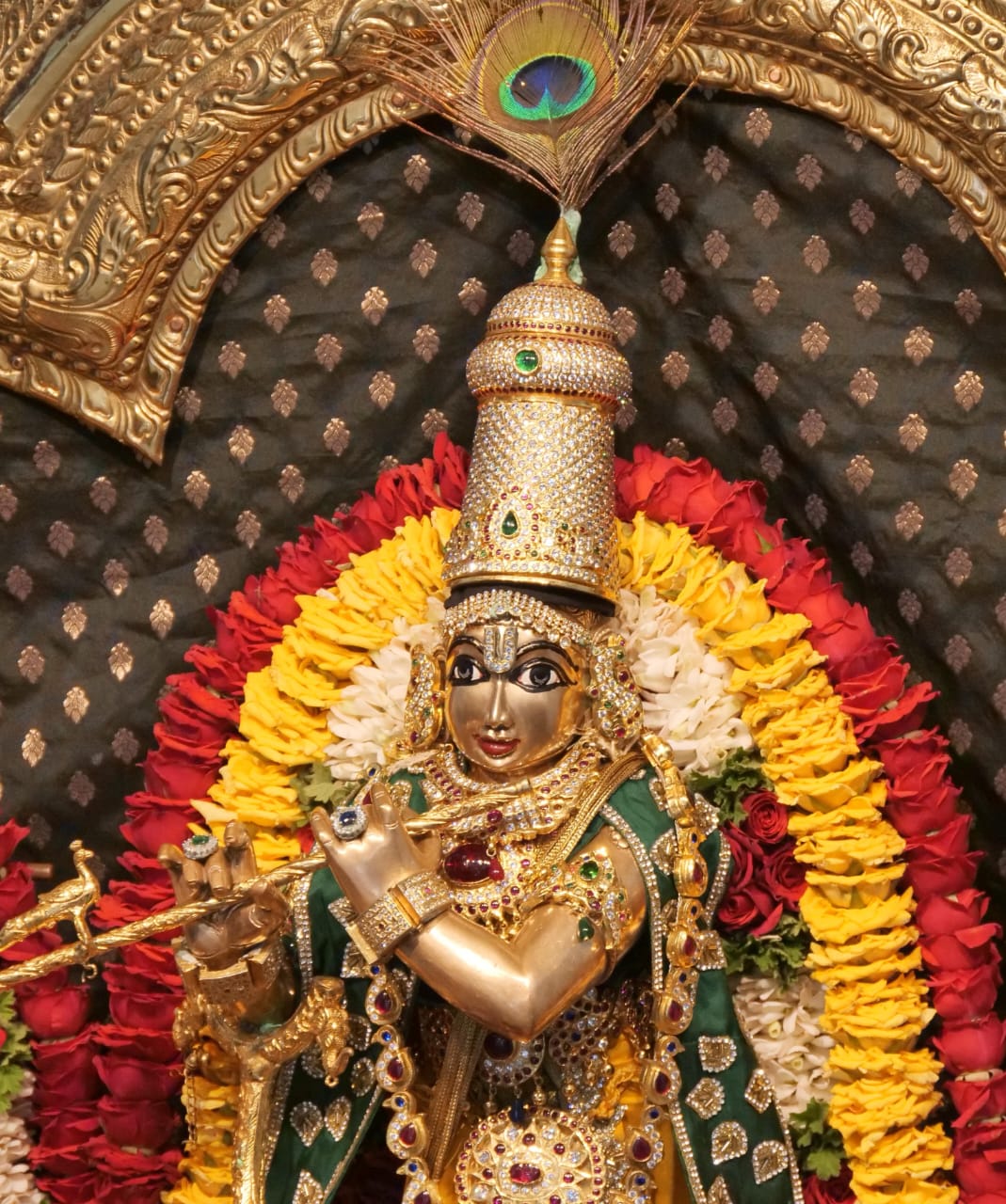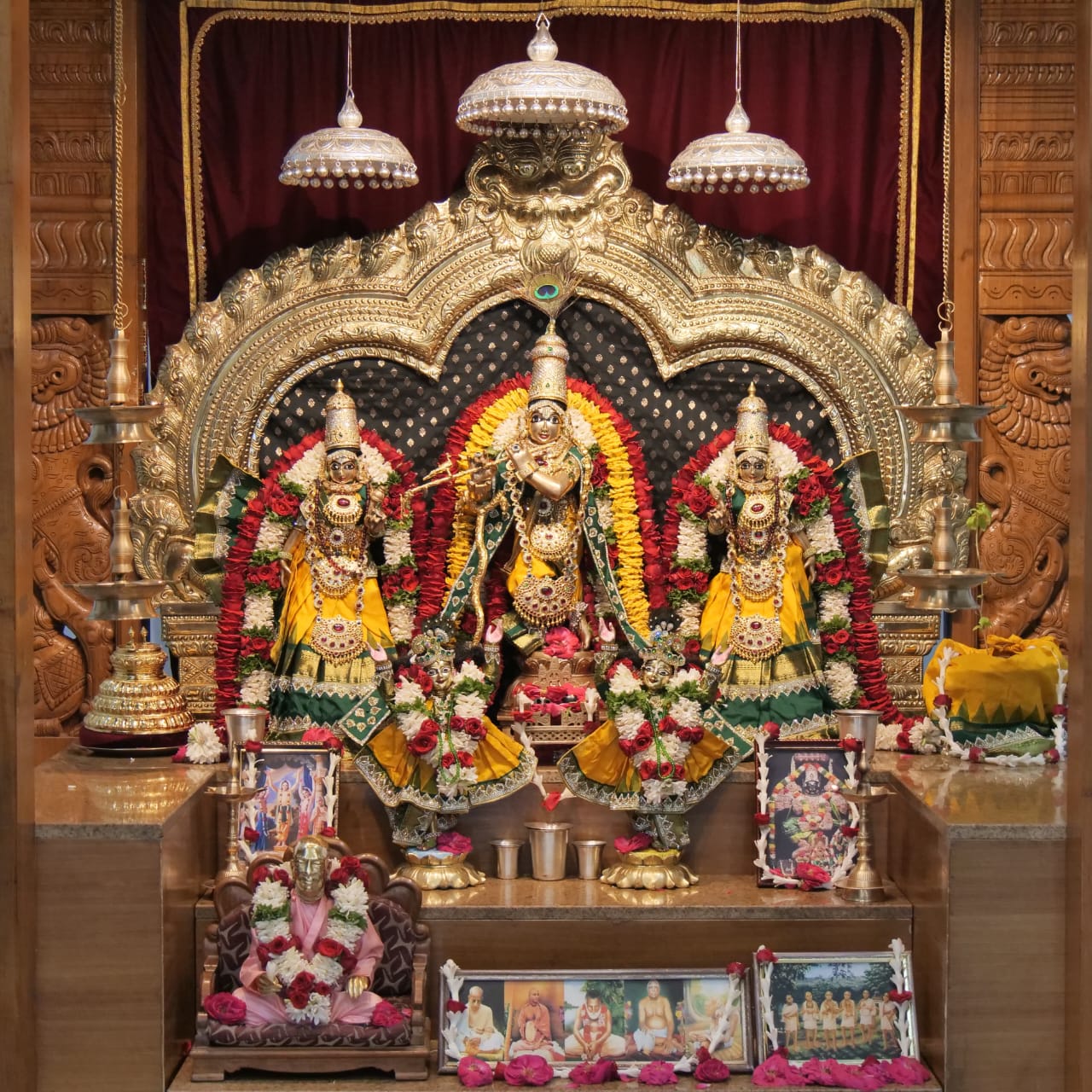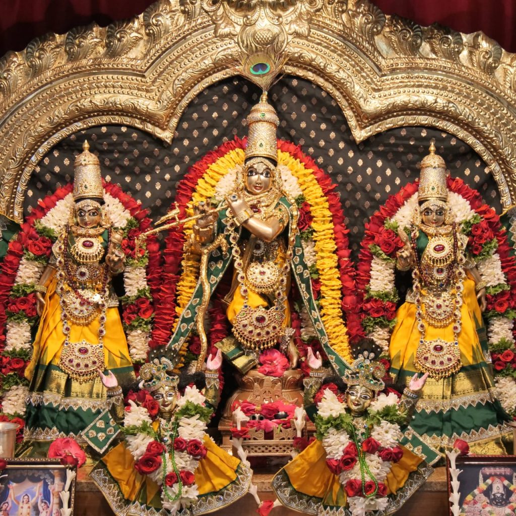 Today’s darshan of Their Lordships Arulmigu Sri Krishna Rukmini Satyabhama, Sri Sri Nitai Gauranga and Srila Prabhupada at Dakshina Dwaraka Dhama, HKM Chennai